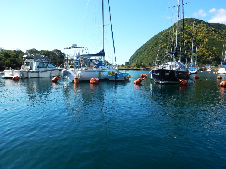 使用後はおもて舫ロープは岸壁の係船環に、両とも舫ロープは1本は水面のブイへ、もう1本は隣のテンダーボートに係留して下さい。